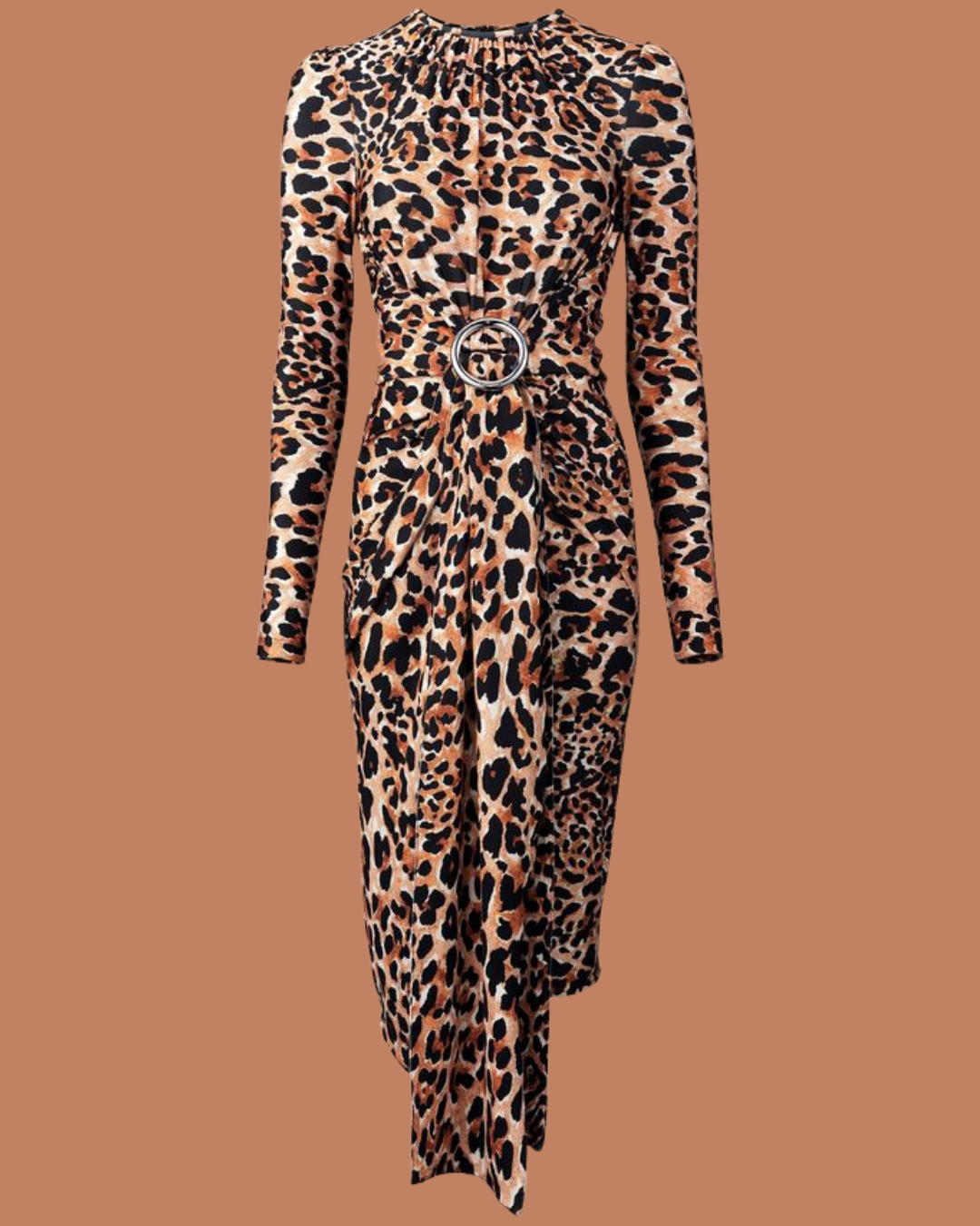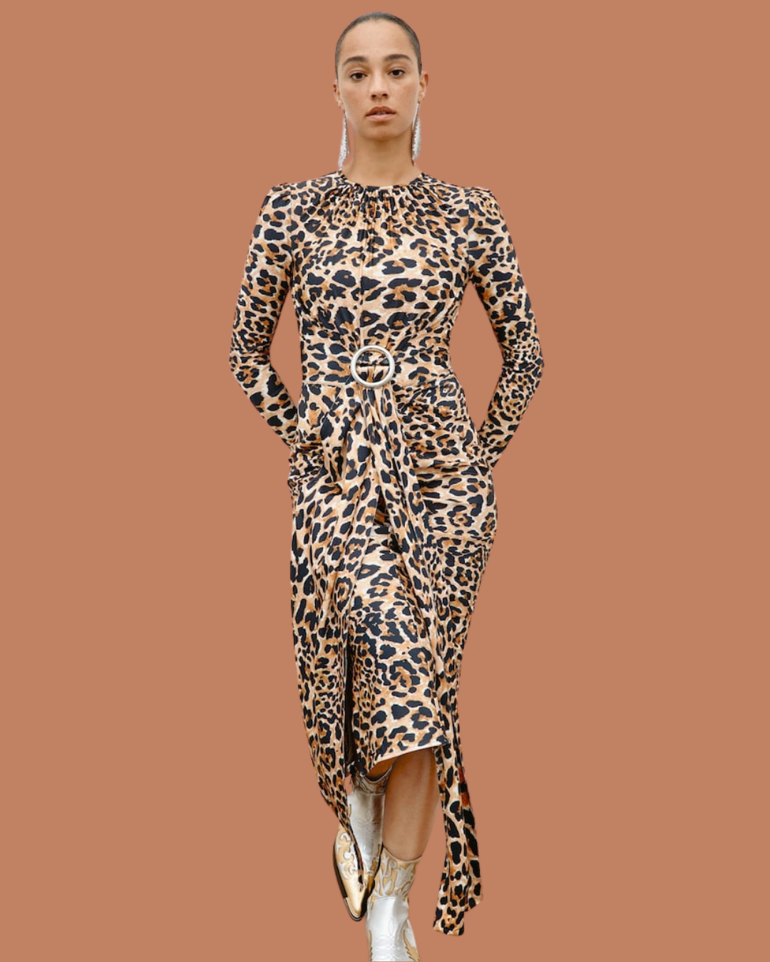 Statement leopard print midi dress from the Rabanne x H&M collaboration. Designed with a sleek, body-skimming silhouette, this piece features long sleeves, a gathered neckline, and a cinched waist accented by a signature circular metal ring detail. The fluid stretch fabric drapes beautifully over the body, creating a flattering and elongating effect. Bold yet refined, this dress channels Rabanne’s iconic glamour while remaining wearable for both day-to-night styling.