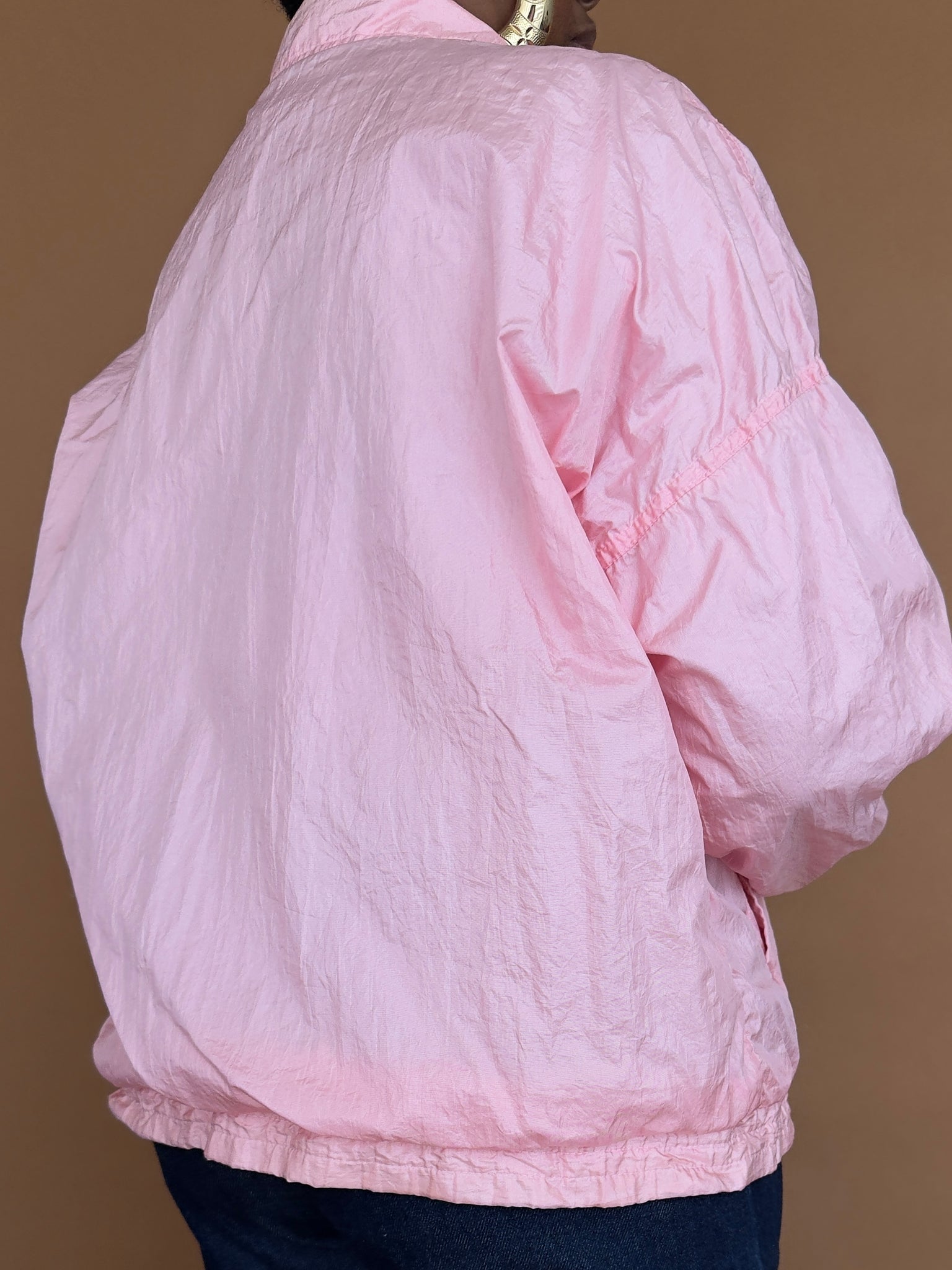 A delicate take on everyday outerwear. This blush pink jacket features a relaxed, slightly cropped silhouette with a lightweight feel that’s perfect for layering without bulk. The soft crinkle texture adds dimension while keeping the look easy and wearable.