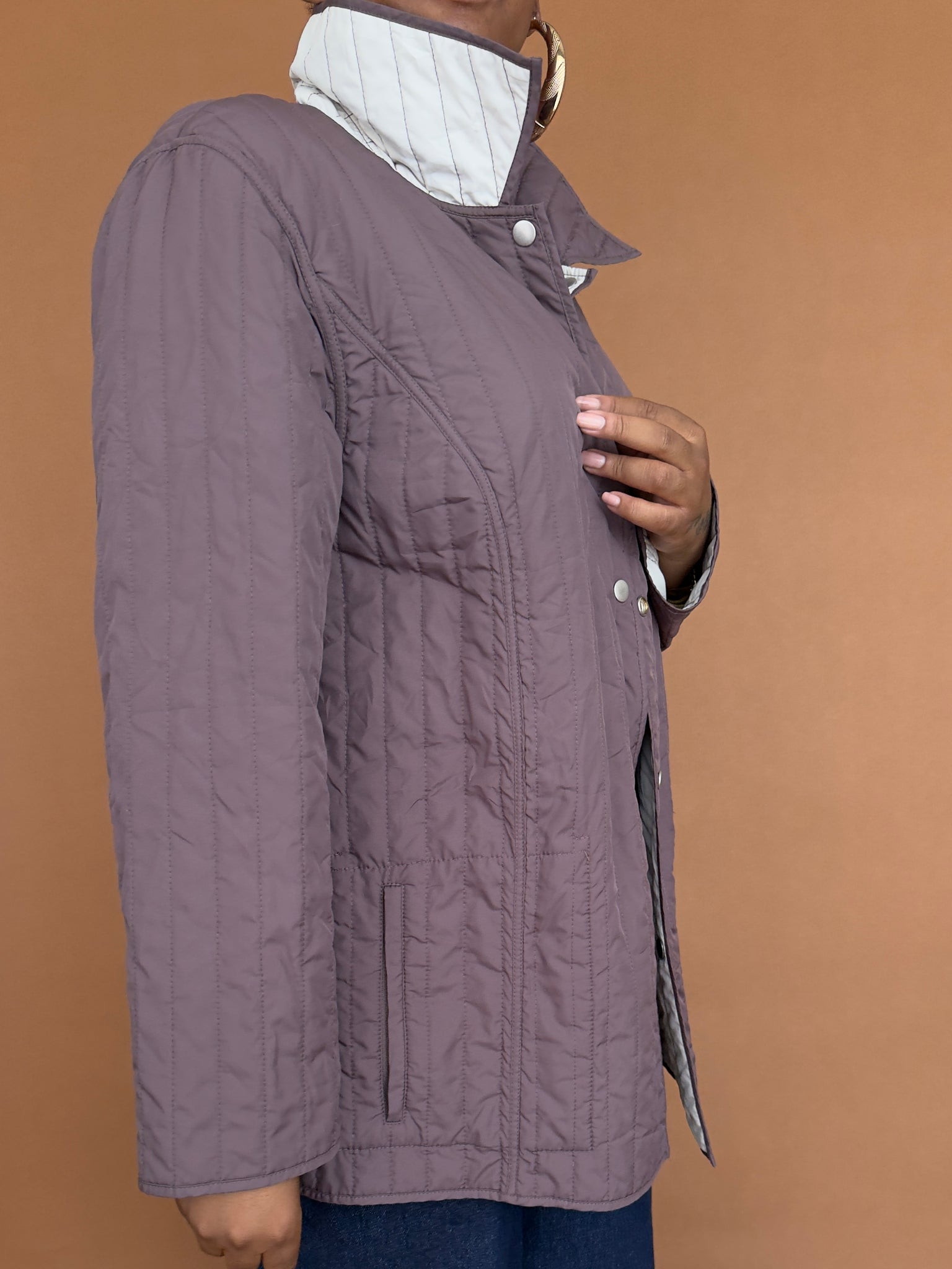 A versatile, lightweight quilted jacket designed to move seamlessly between looks. One side features a soft off-white tone with subtle stitched detailing, while the reverse reveals a muted mauve finish for a warmer, moodier feel. Finished with a relaxed fit and snap-button closure, it’s equal parts practical and refined.