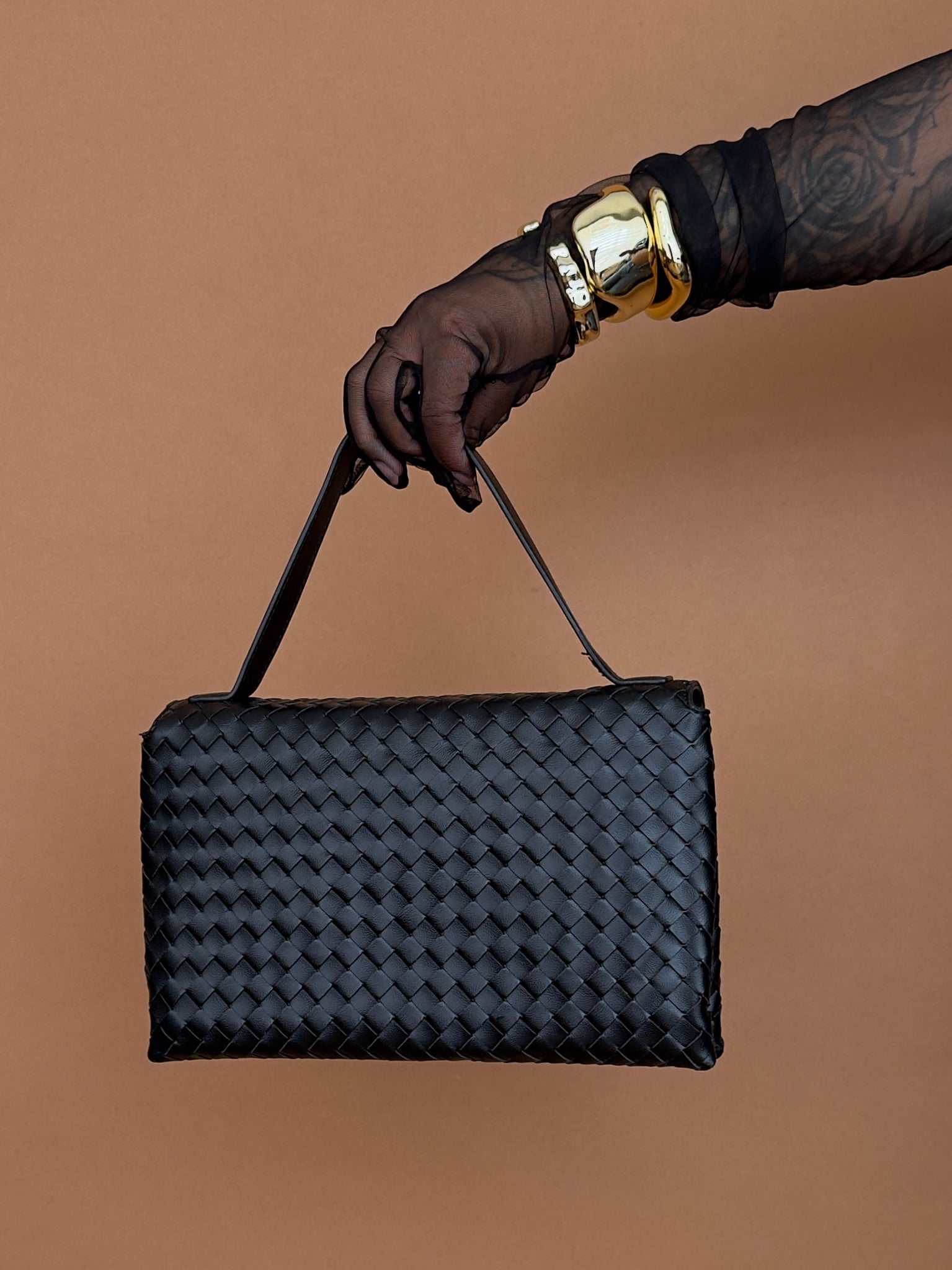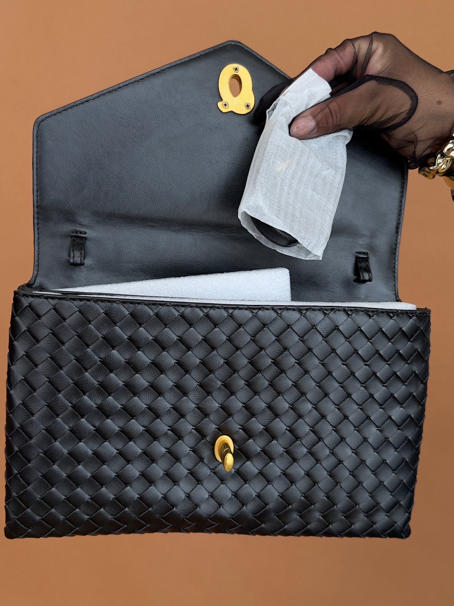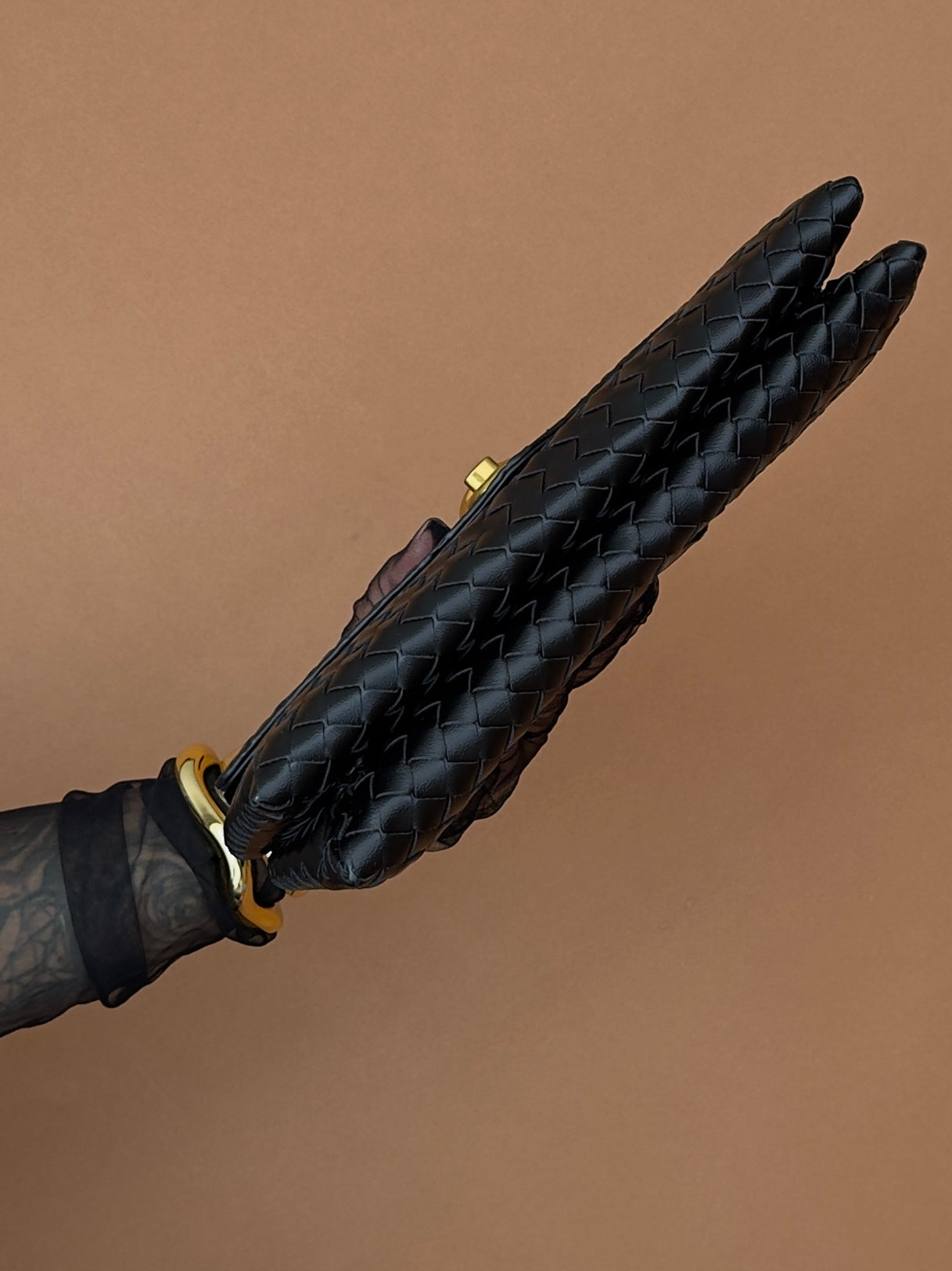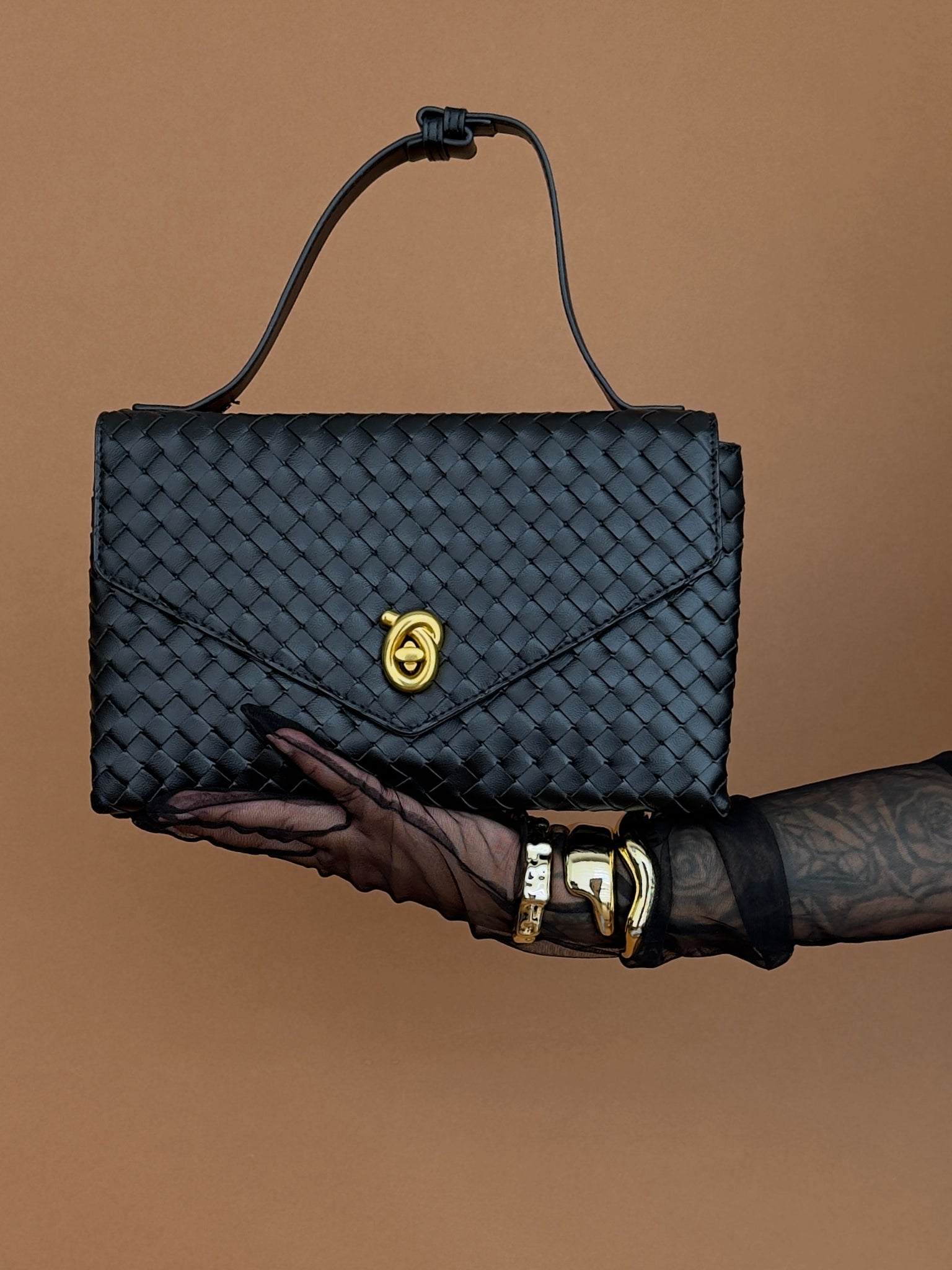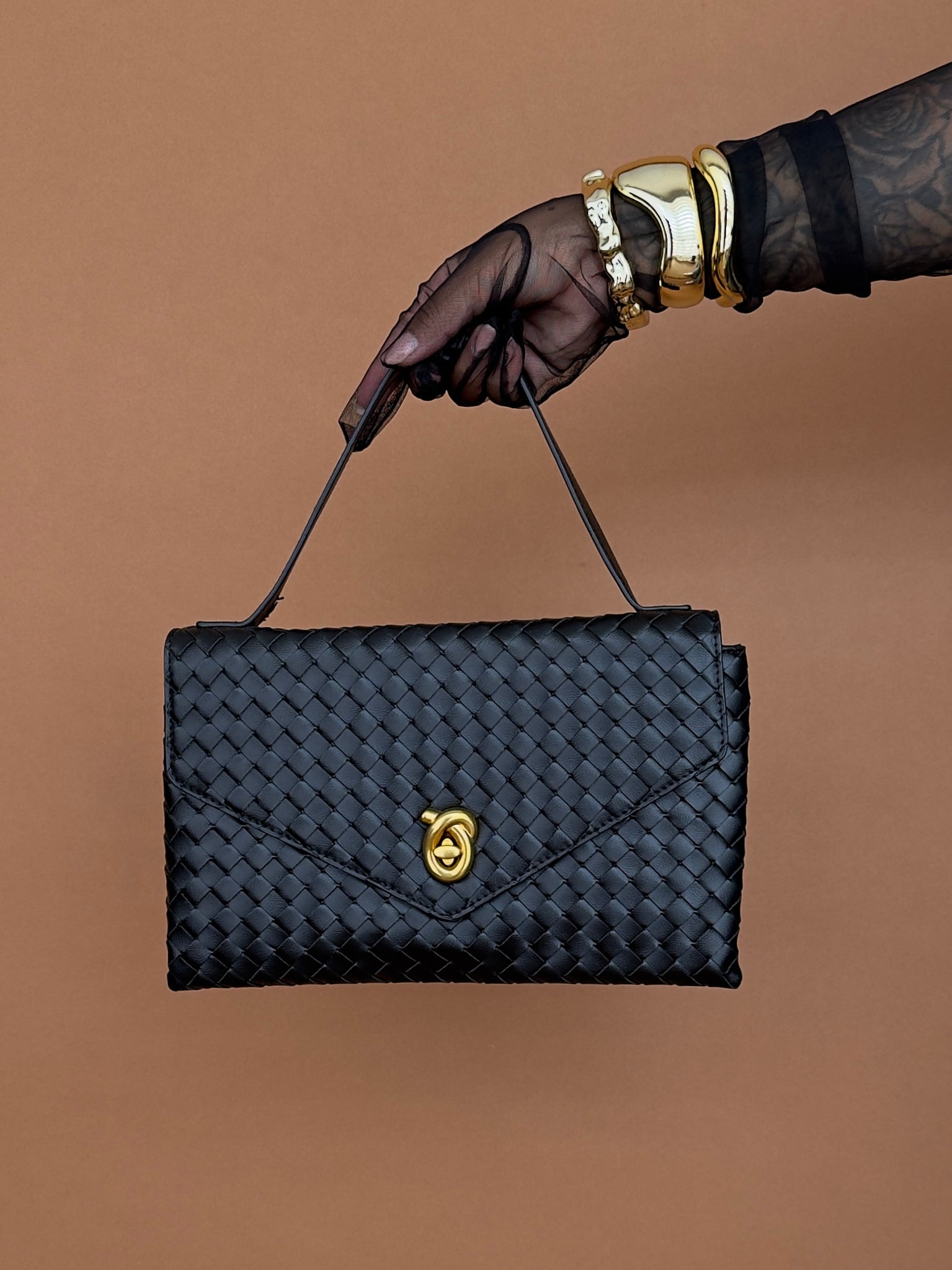 A timeless envelope-style shoulder bag crafted from intricately woven genuine leather in classic black. The structured flap silhouette is complemented by a refined gold-tone turn-lock closure, adding a subtle touch of polish. Finished with a slim top handle for an elegant hand-held carry, this piece balances texture and minimalism effortlessly. Perfect for evenings, events, or elevating a pared-back daytime look, it’s a versatile staple that delivers quiet luxury without overstatement.