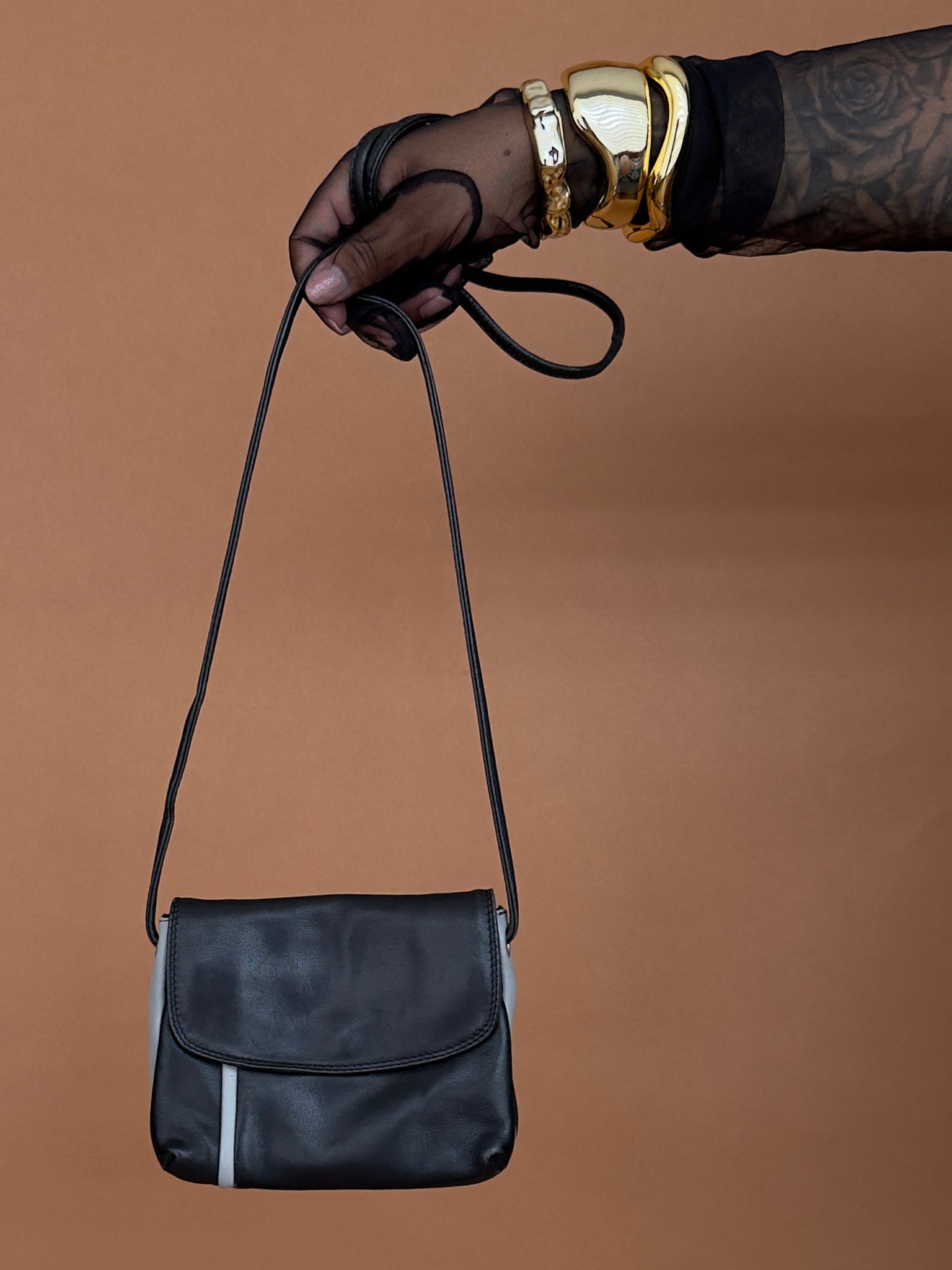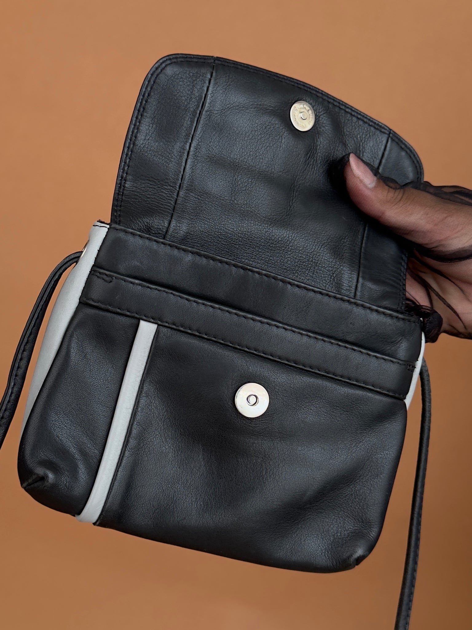 A timeless, minimalist sling bag crafted from genuine leather. Designed in a compact, structured silhouette, this piece features a flap-front closure with press stud fastening, a slim adjustable shoulder strap, and subtle contrast trim that adds quiet visual interest. The interior offers enough space for everyday essentials, making it ideal for daily wear without compromising on style. A versatile accessory that transitions effortlessly from casual daytime looks to elevated evening outfits.